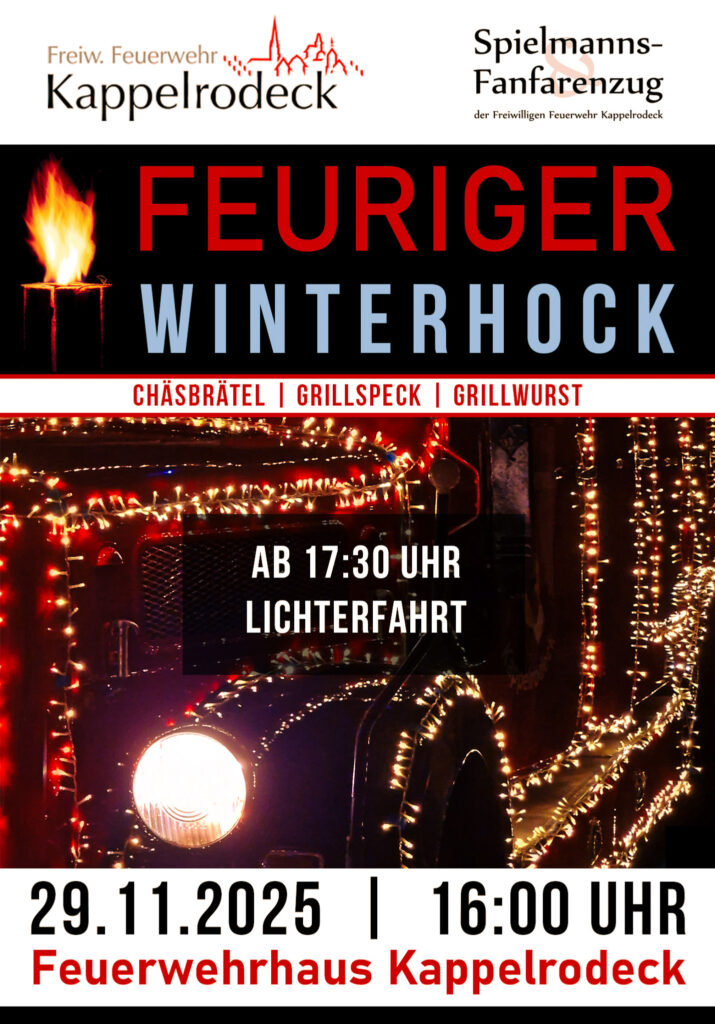 Wie die letzten Jahre findet am Samstag vor dem 1. Advent, also dem 29.11.2025, ab 16:00 Uhr unser feuriger Winterhock statt. Mit Glühwein, kalten Getränken und Essen möchten wir hier ein paar schöne Stunden in winterlicher Atmosphäre verbringen und freuen uns über einen Besuch.